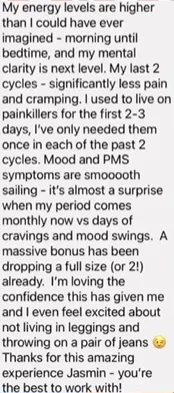 "My clothes fit better. I've dropped two siezes. My energy is higher than I ever imagined. I finally feel confident enough to swap leggings for jeans again. My mental clarity is next-level, and my last two cycles came with far less pain and cramping." (Crystal)